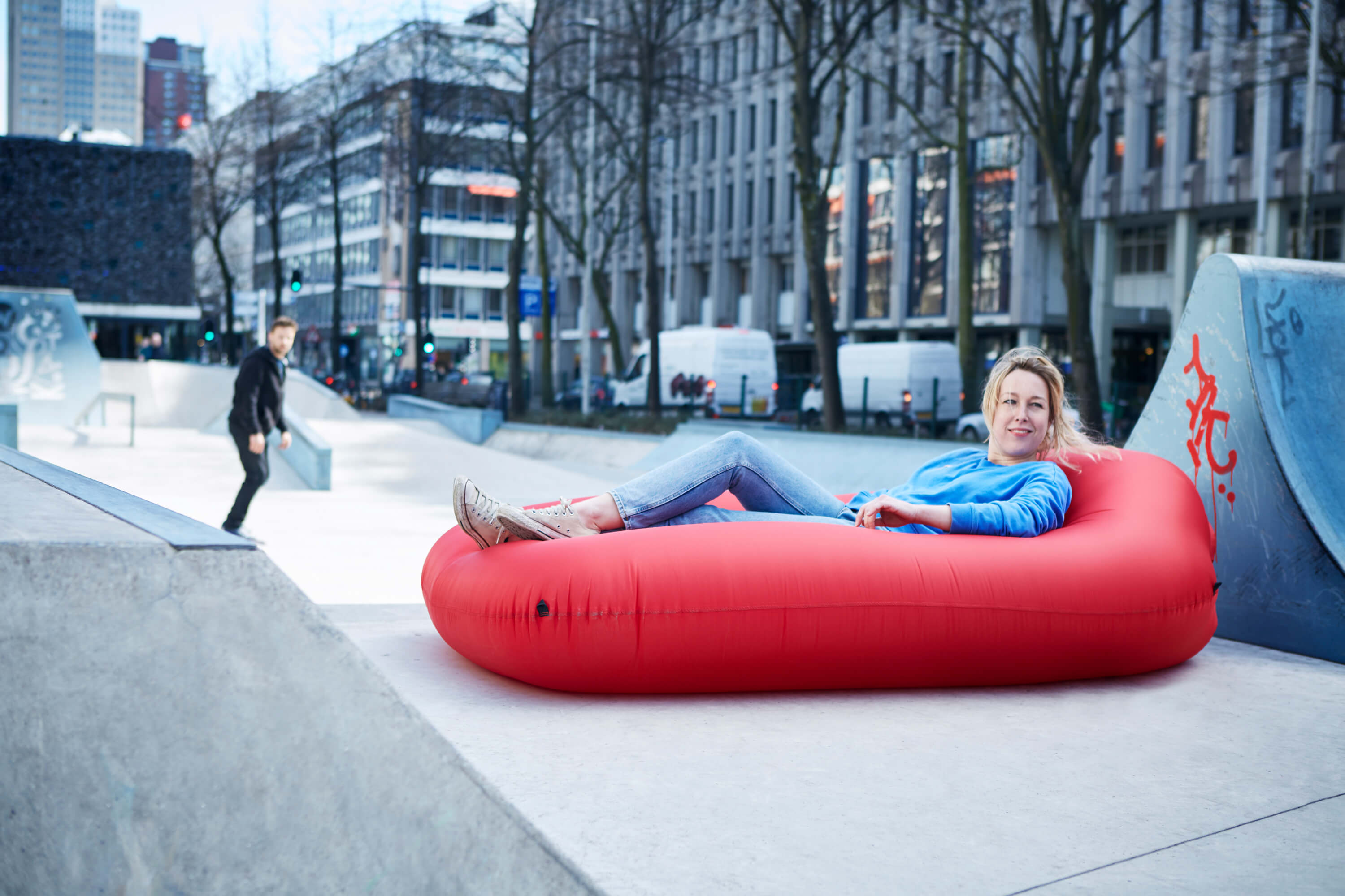 Lamzac L ist ein aufblasbares Lounge-Bett für Deinen Garten oder den Strand. Bewege die aufblasbare Liege durch die Luft, um sie zu füllen, rolle sie ein und entspanne Dich. Das Ripstop-Nylon und die wasserdichte Beschichtung machen das aufblasbare Lounge-Bett zu einer robusten Luft-Liege, die auch mit nach draußen genommen werden kann. Und wenn Du Deinen Lamzac L mit den mitgelieferten Erdnägeln sicherst, wird er auch nicht weggeweht.