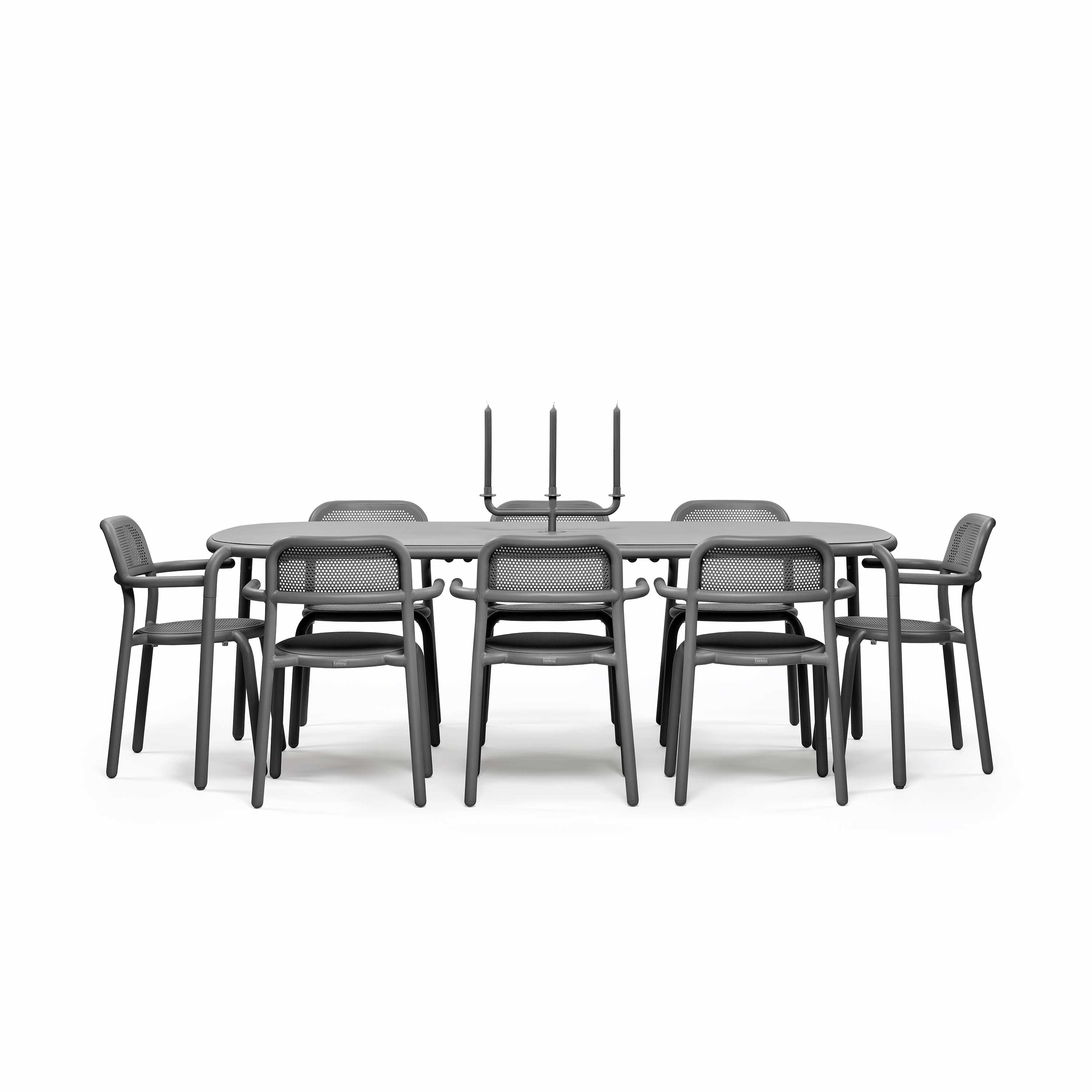 Möchten Sie ein entspanntes Abendessen im Freien mit Ihrer Familie und Ihren Freunden genießen? Klingt, als könnte Toní Tablo Ihnen dabei helfen. Bei einer Länge von 2,2 Metern bietet der Tisch bis zu 8 Personen Platz. Das Aluminiummaterial lässt den Tisch schön leicht sein, sodass Sie ihn mühelos bewegen können. Das Loch in der Mitte dient tagsüber als Schirmhalter und kann nachts für den 3-armigen Toní-Kerzenhalter verwendet werden. Toní ist ein echter Gewinner.Der Toní Tablo ist leicht zu pflegen und da er mit der hochwertigsten Außenbeschichtung behandelt wurde, ist der Tisch rostfrei, wetterfest und farbecht.