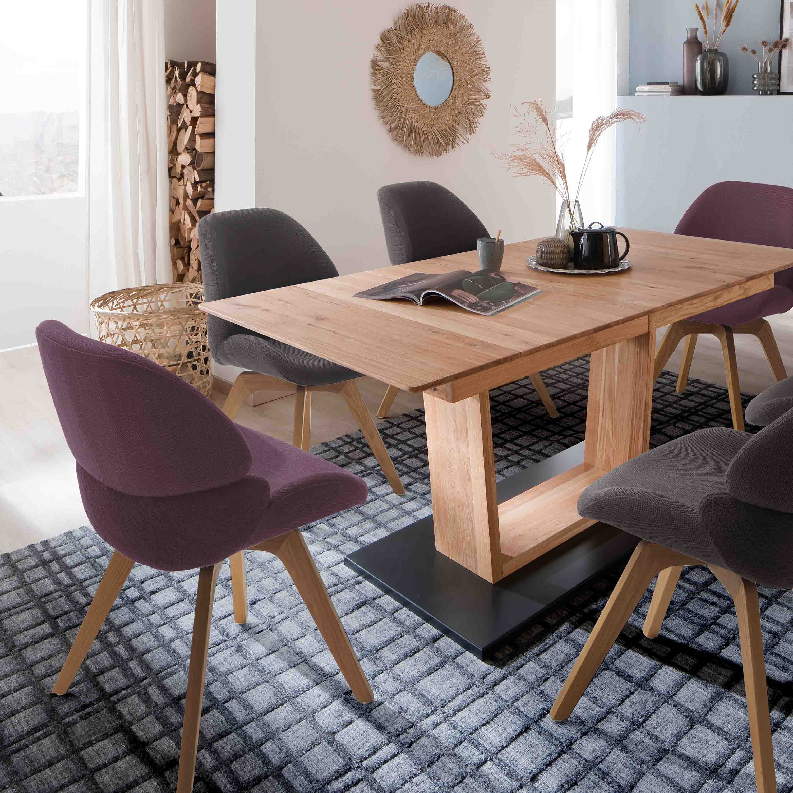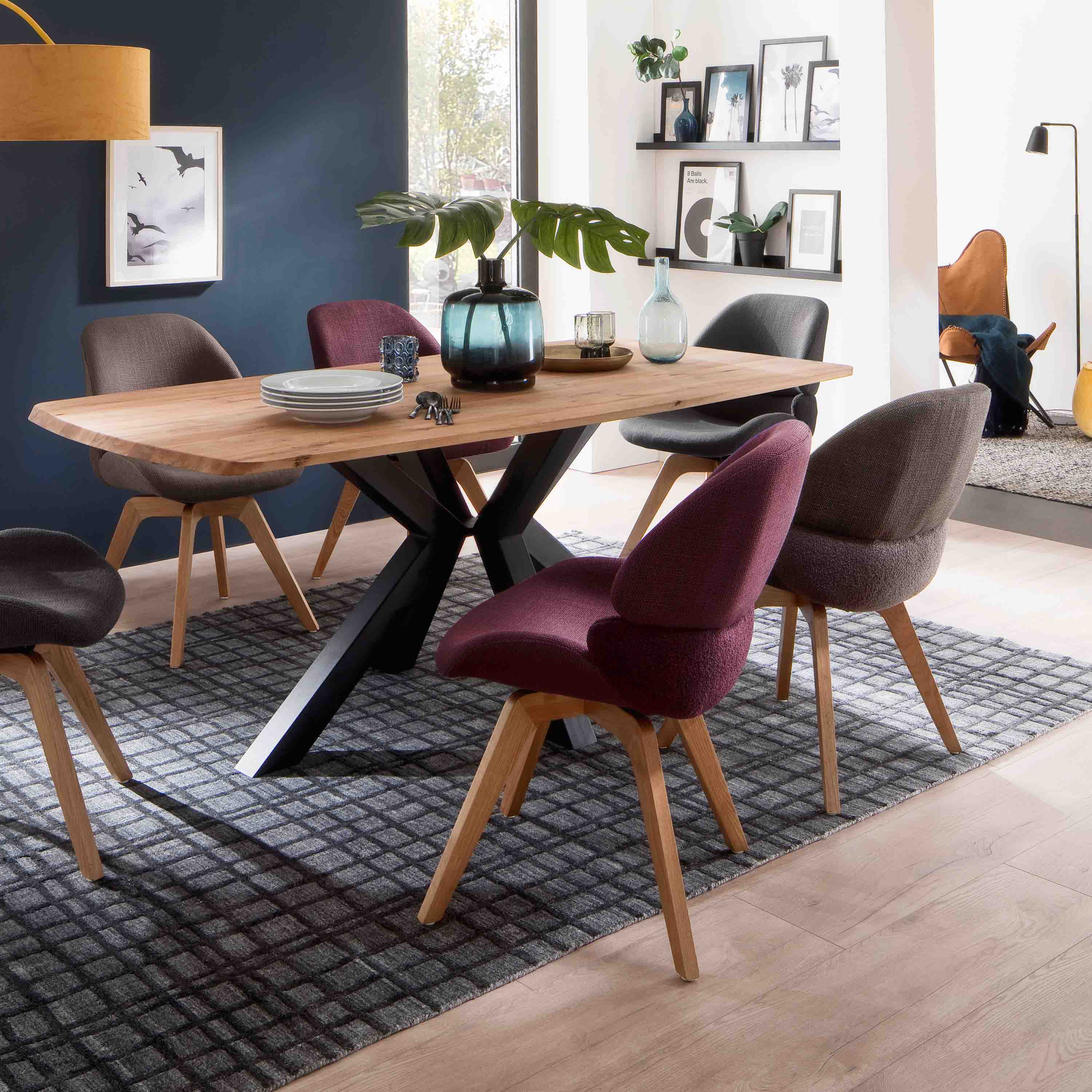 Stühle 2-er Set mit Stoffbezug innen in Chenille Optik und Mittelteil mit Feinflor. Gestell in Eiche Massiv lackiert. Stuhl 180°drehbar mit Nivellierung. Diese sorgt dafür, das sich der Stuhl automatisch wieder in seine ursprüngliche Position dreht. Stuhl belastbar bis 120 kg. Nettogewicht 9,6 kg. Sitzmaß BxHxT 38x49x46cm, Stellmaß BxHxT 52x85x65 cm. Die Lieferung erfolgt zerlegt inkl. Aufbauanleitung.