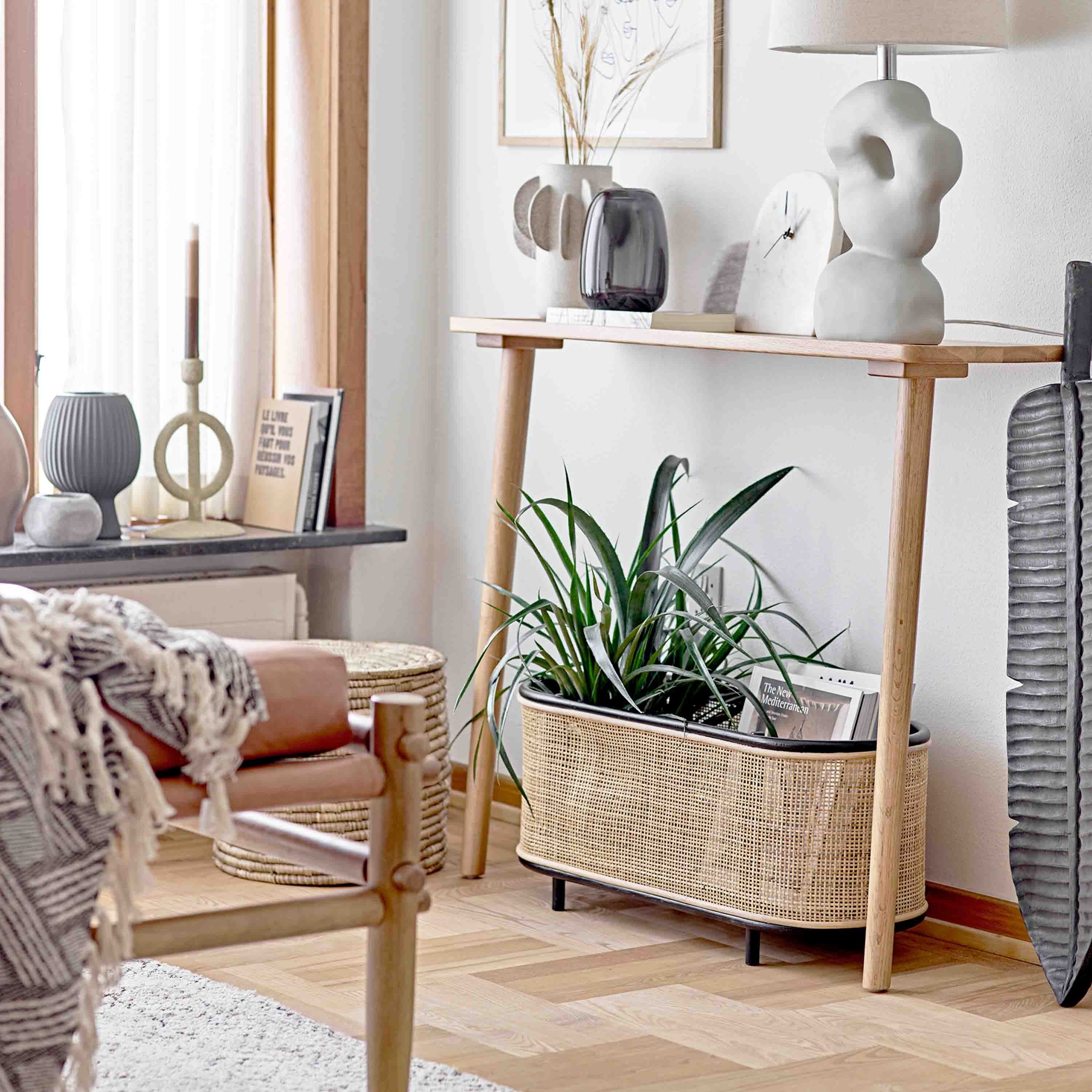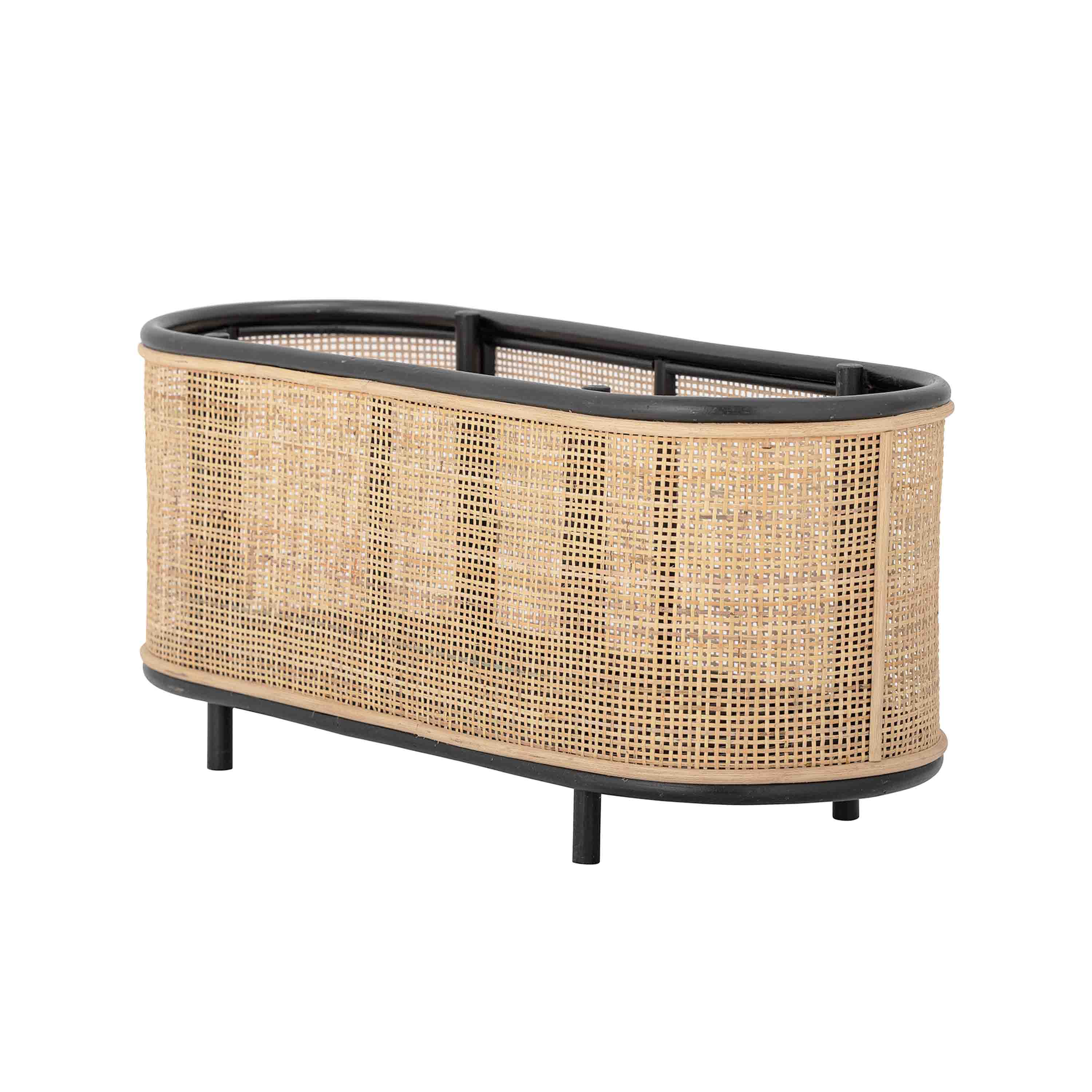 Die Ebbie Plant Box von Bloomingville ist eine schöne ovale Box mit kleinen Beinen. Es hat einen schönen und natürlichen Look aus einem Rohrrahmen mit gewebtem Rattan. Einfach perfekt in allen Räumen für Pflanzen und Deko für eine natürliche Note.