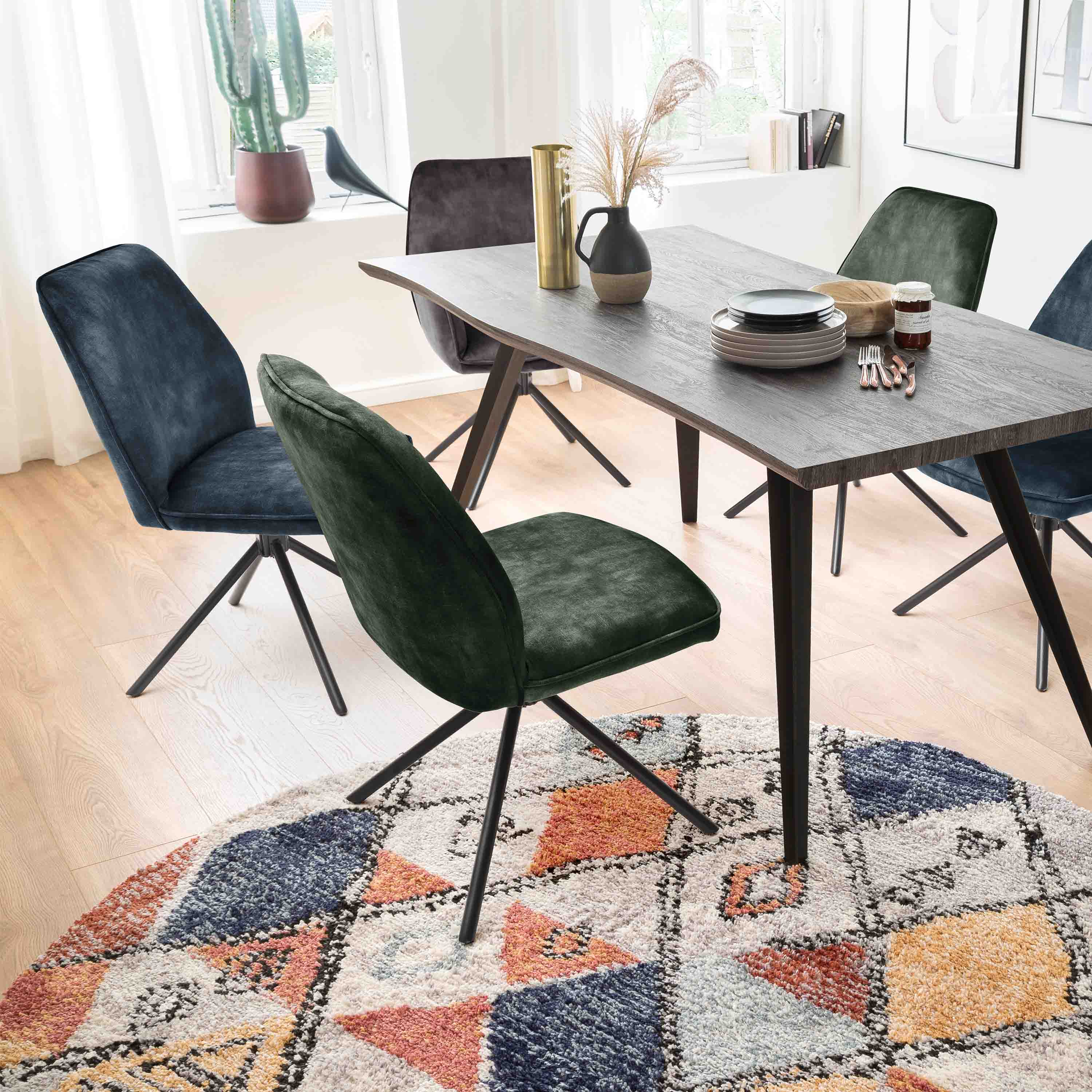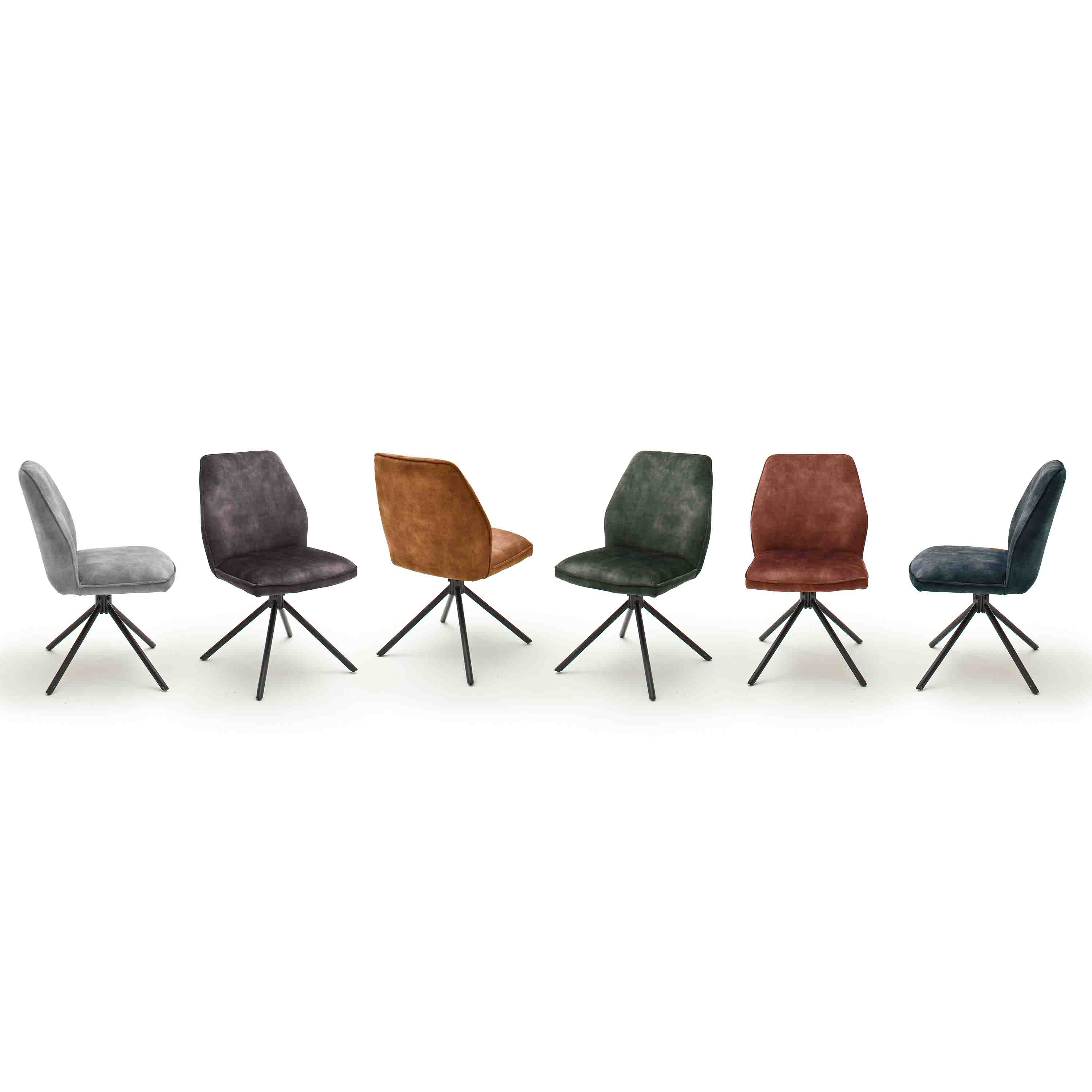 Esszimmerstühle 2er-Set mit Stoffbezug im Vintage Veloursoptik mit Keder. Keder in Stuhlfarbe. Gestell rund in schwarz matt lackiert. Stuhl 180°drehbar mit Nivellierung. Diese sorgt dafür, das sich der Stuhl automatisch wieder in seine ursprüngliche Position dreht. Stuhl belastbar bis max. 120 kg. nettogewicht 7,3 kg. Sitzmaße BxHxT 50x50x44 cm, Stellmaß BxHxT 52x89x64 cm. Die Lieferung erfolgt zerlegt inkl. Aufbauanleitung.